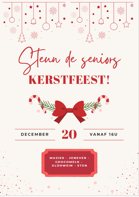 Het is bijna zover: we sluiten het jaar weer gezellig af met het kerstfeest van de seniors! Op 20 december, meteen na de vergadering, vieren we samen zoals altijd met heerlijk eten, warme glühwein, een frisse jenever en een lekker dessert. Het belooft opnieuw een supergezellige avond te worden, eentje die je zeker niet wilt missen!