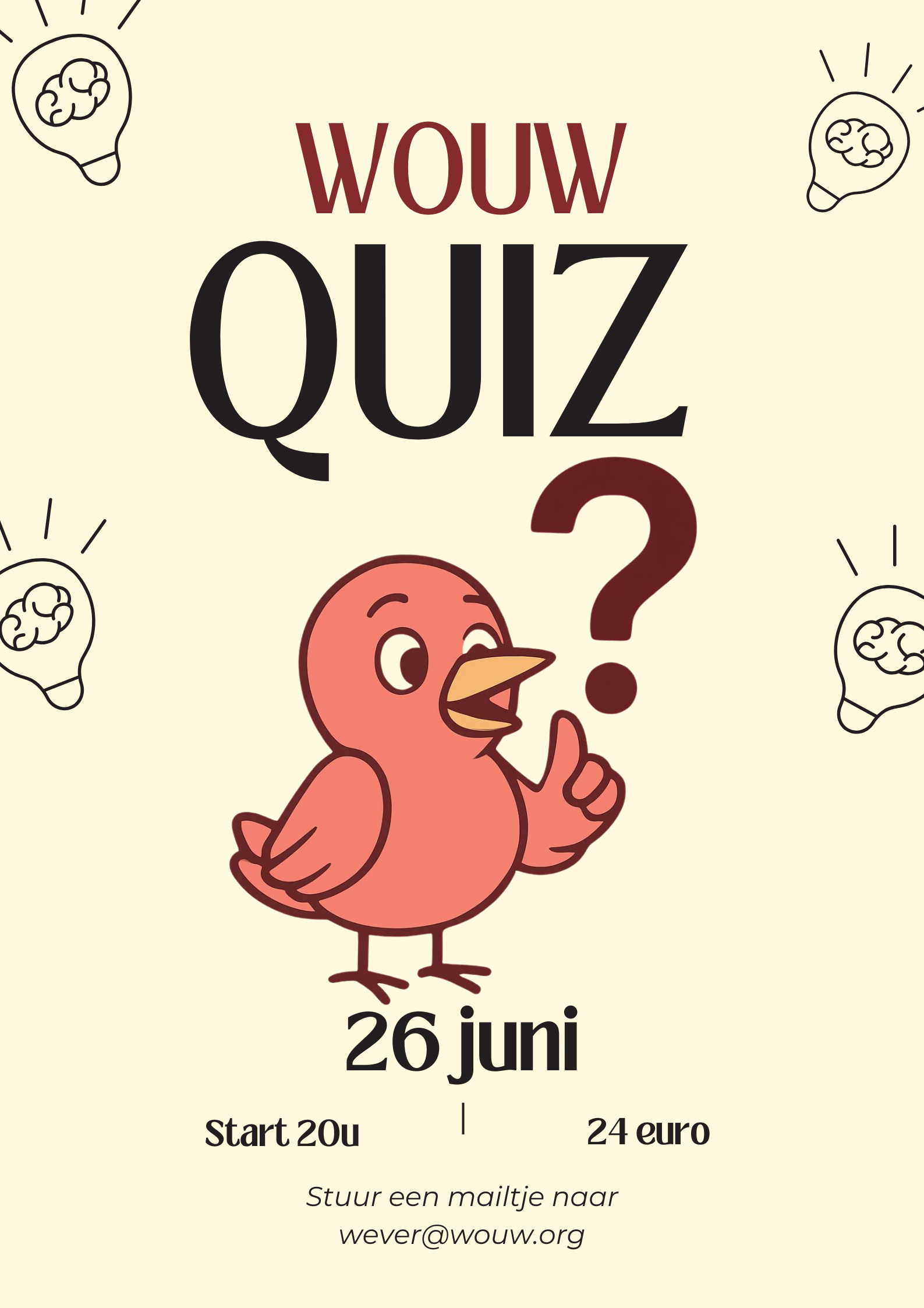 Op 26 juni is het weer tijd voor een avond vol plezier, denkwerk en gezonde competitie tijdens onze 5de Wouw Quiz! Of je nu meespeelt om te winnen of gewoon voor de ambiance komt, iedereen is welkom!
